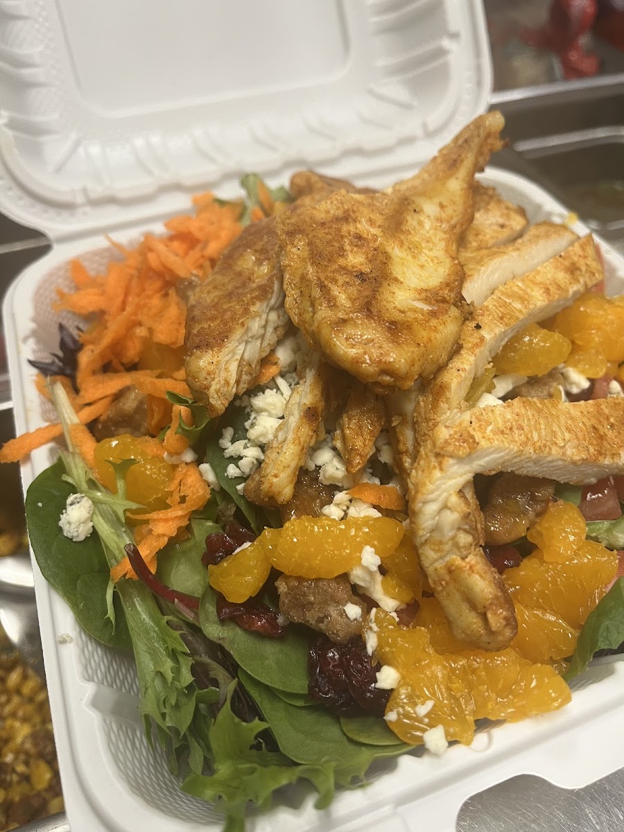 Grilled chicken, roasted corn salsa, chipotle adobo, guacamole, ranch, lettuce and tomato.